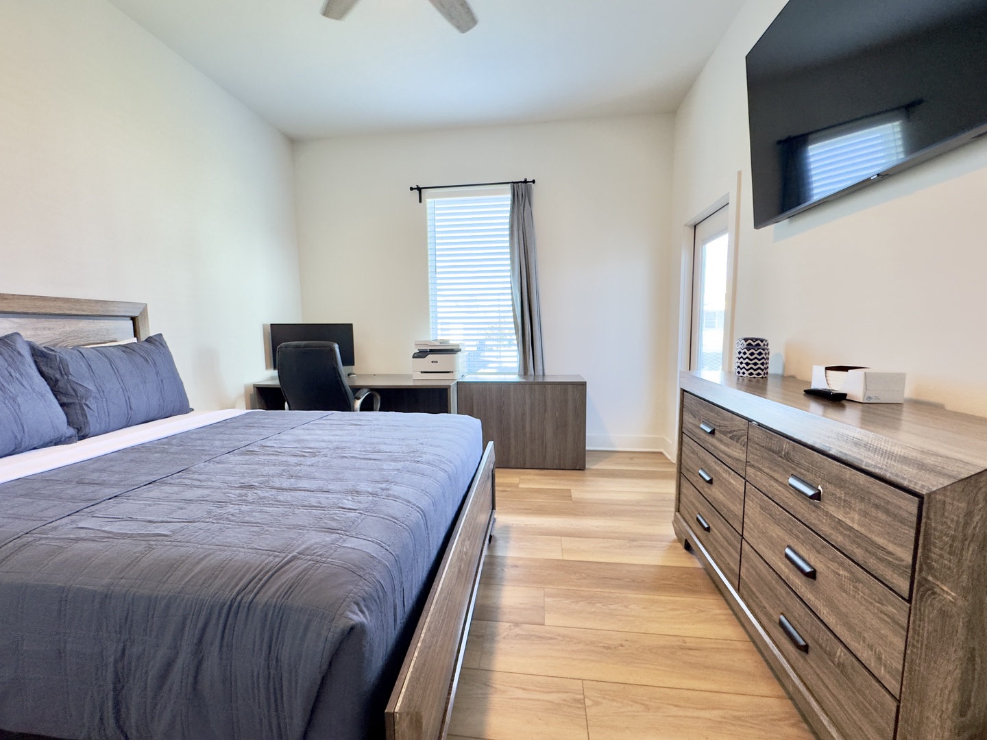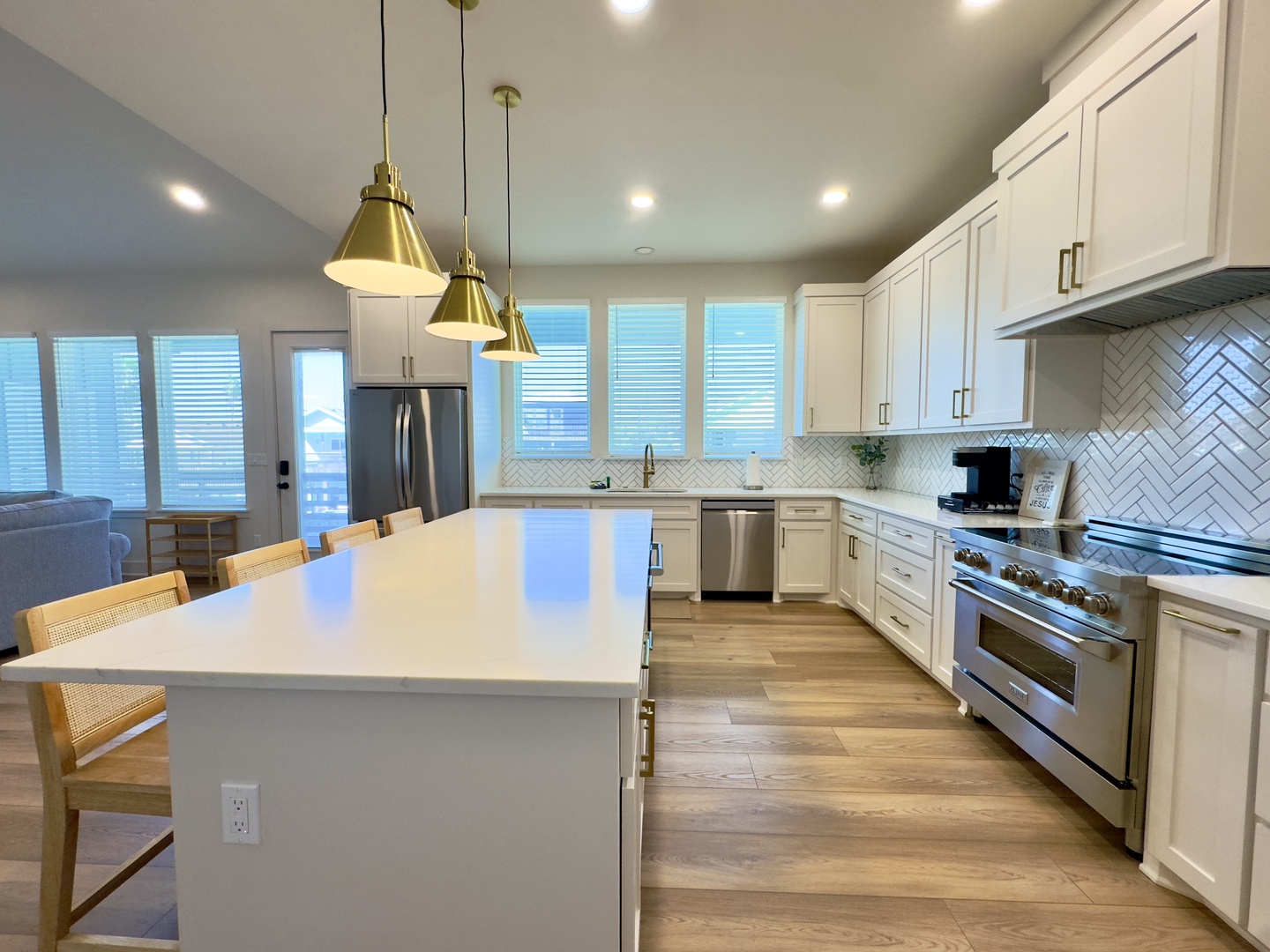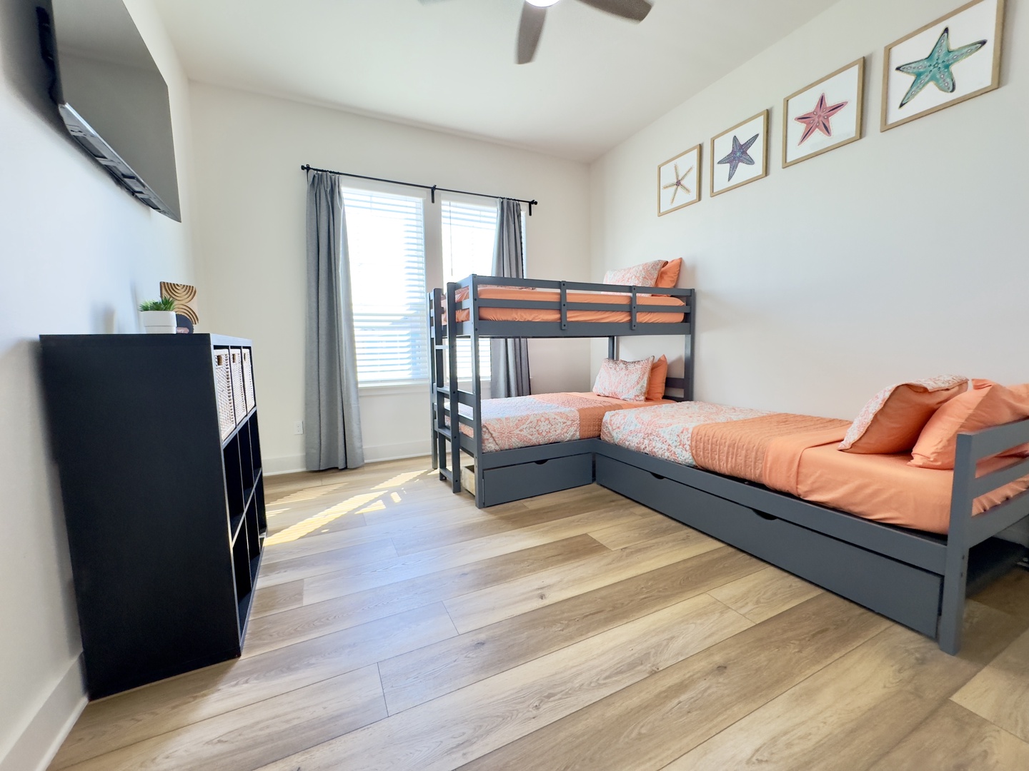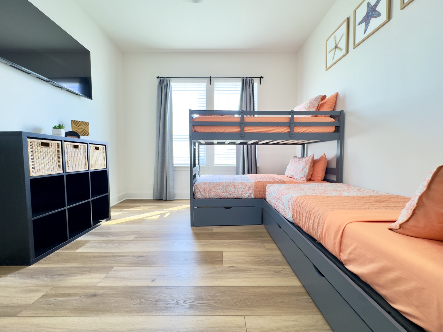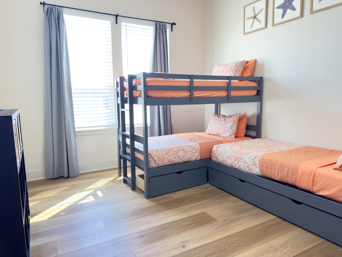 This three bedroom, two bathroom home is fully stocked with everything you need for your home away from home! The master suite has a king bed. One of the guest rooms features three twin beds (one is a bunk). The other guest bedroom has a queen bed and features a desk for a work station. Each room also has a TV. There is a washer and dryer too!