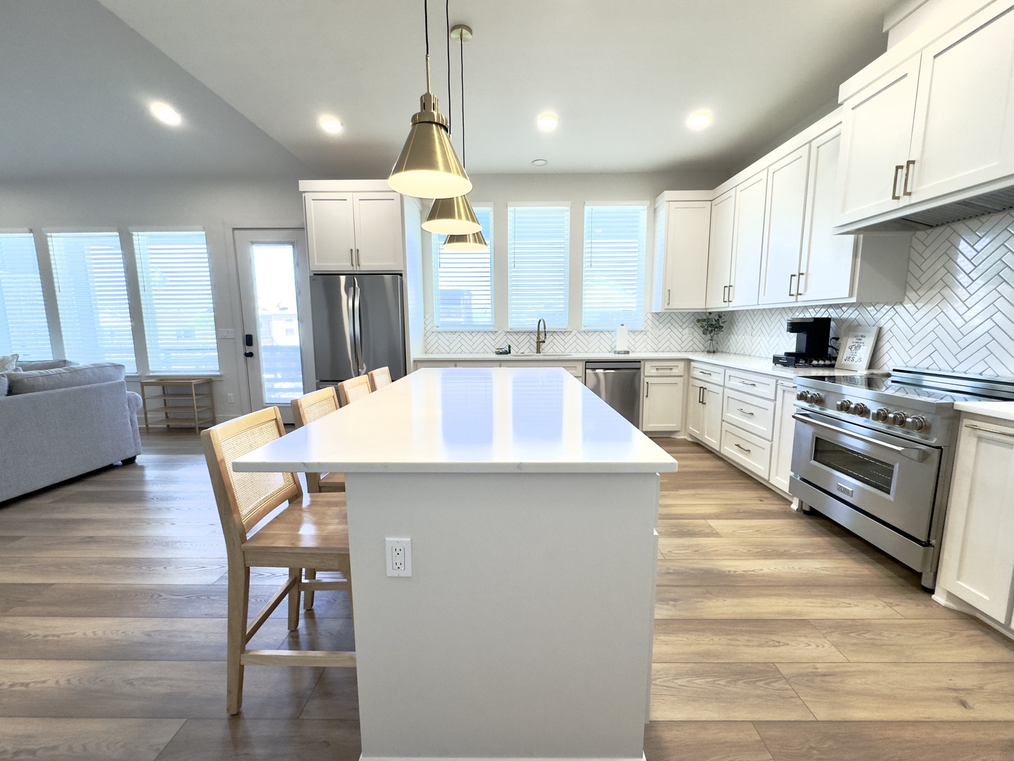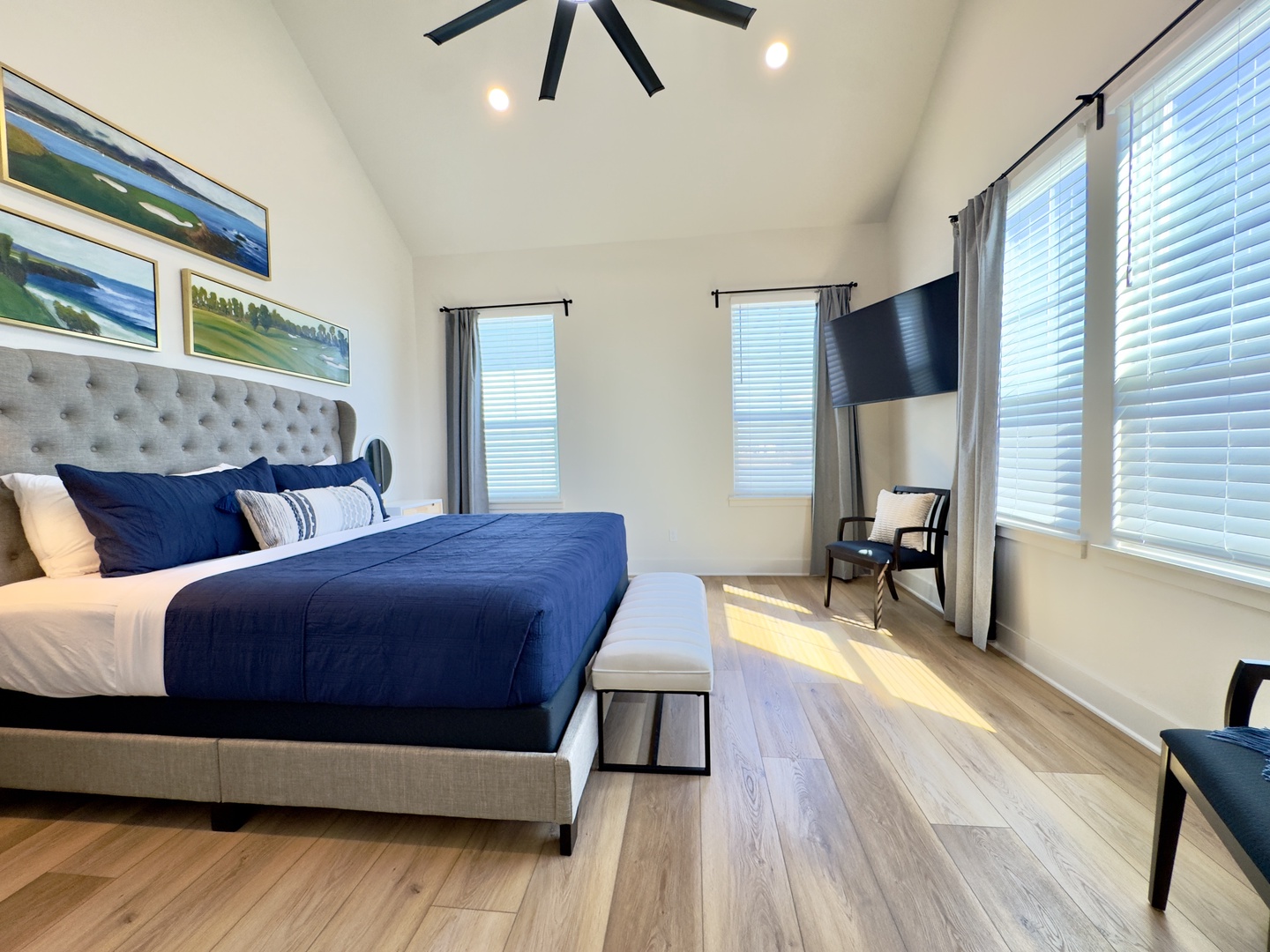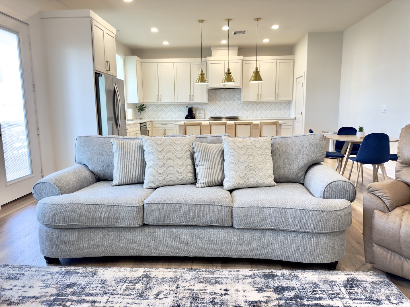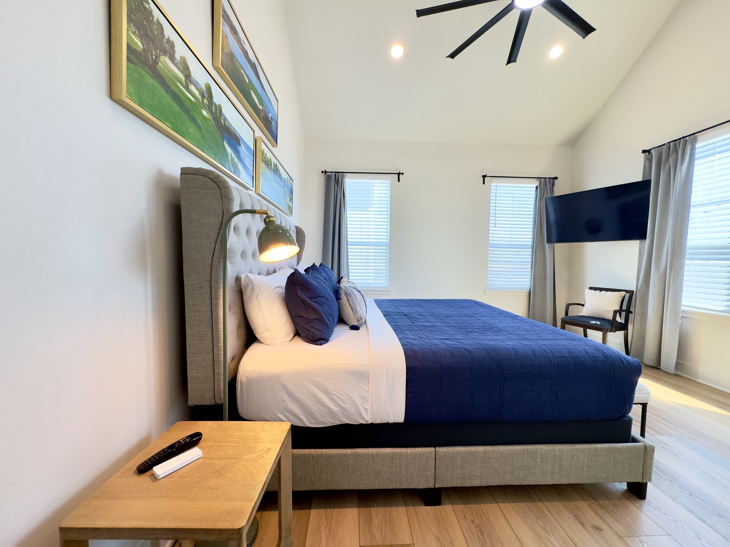 This three bedroom, two bathroom home is fully stocked with everything you need for your home away from home! The master suite has a king bed. One of the guest rooms features three twin beds (one is a bunk). The other guest bedroom has a queen bed and features a desk for a work station. Each room also has a TV. There is a washer and dryer too!