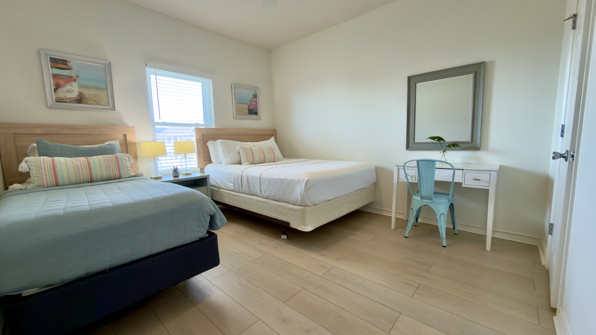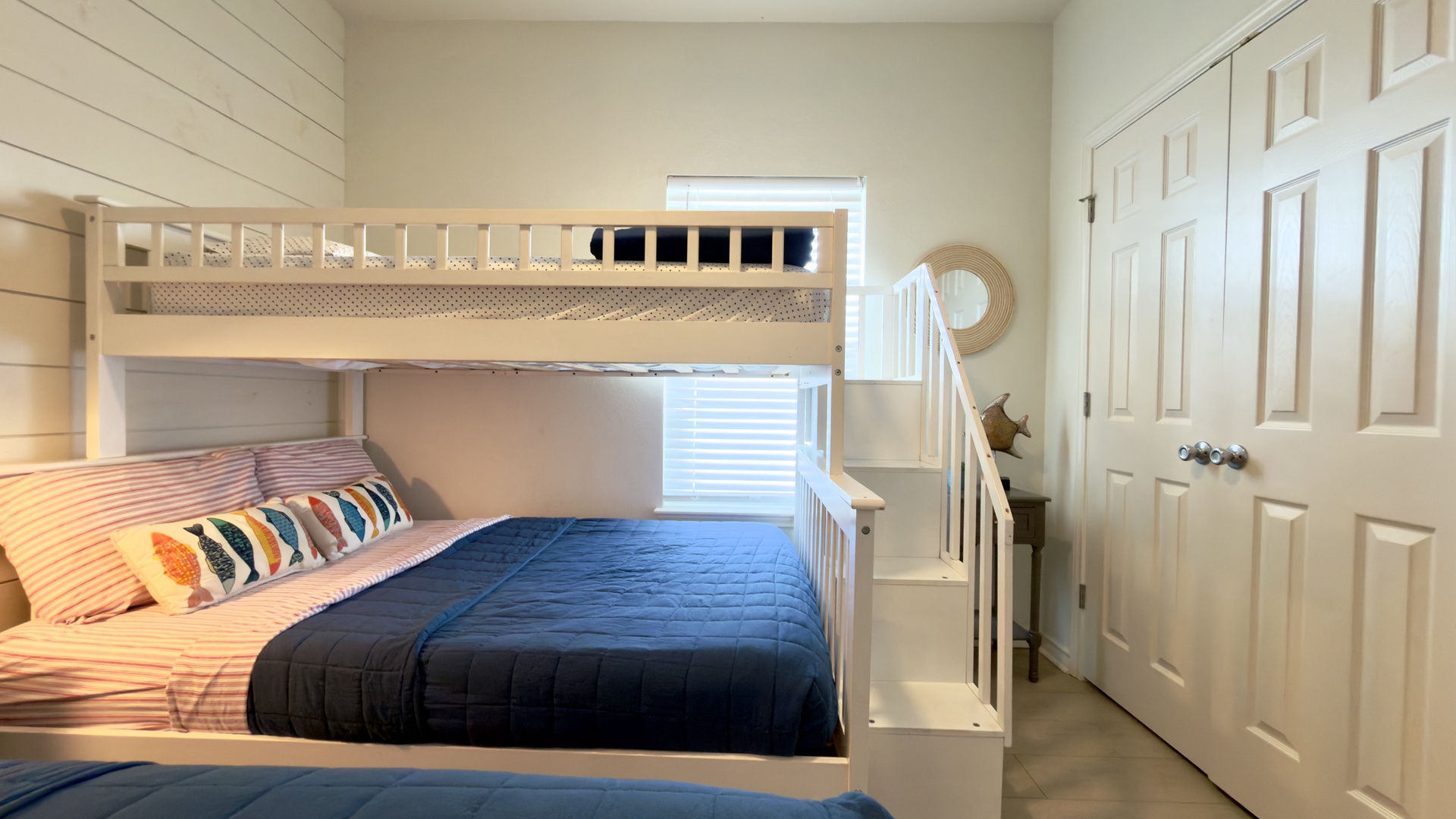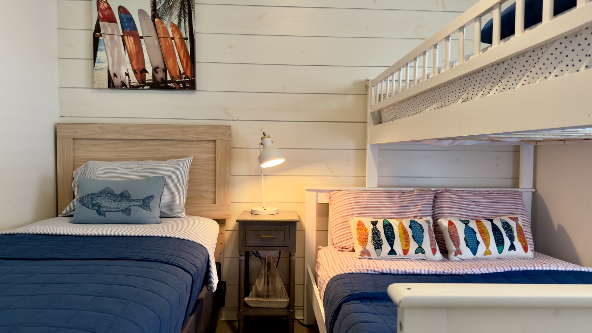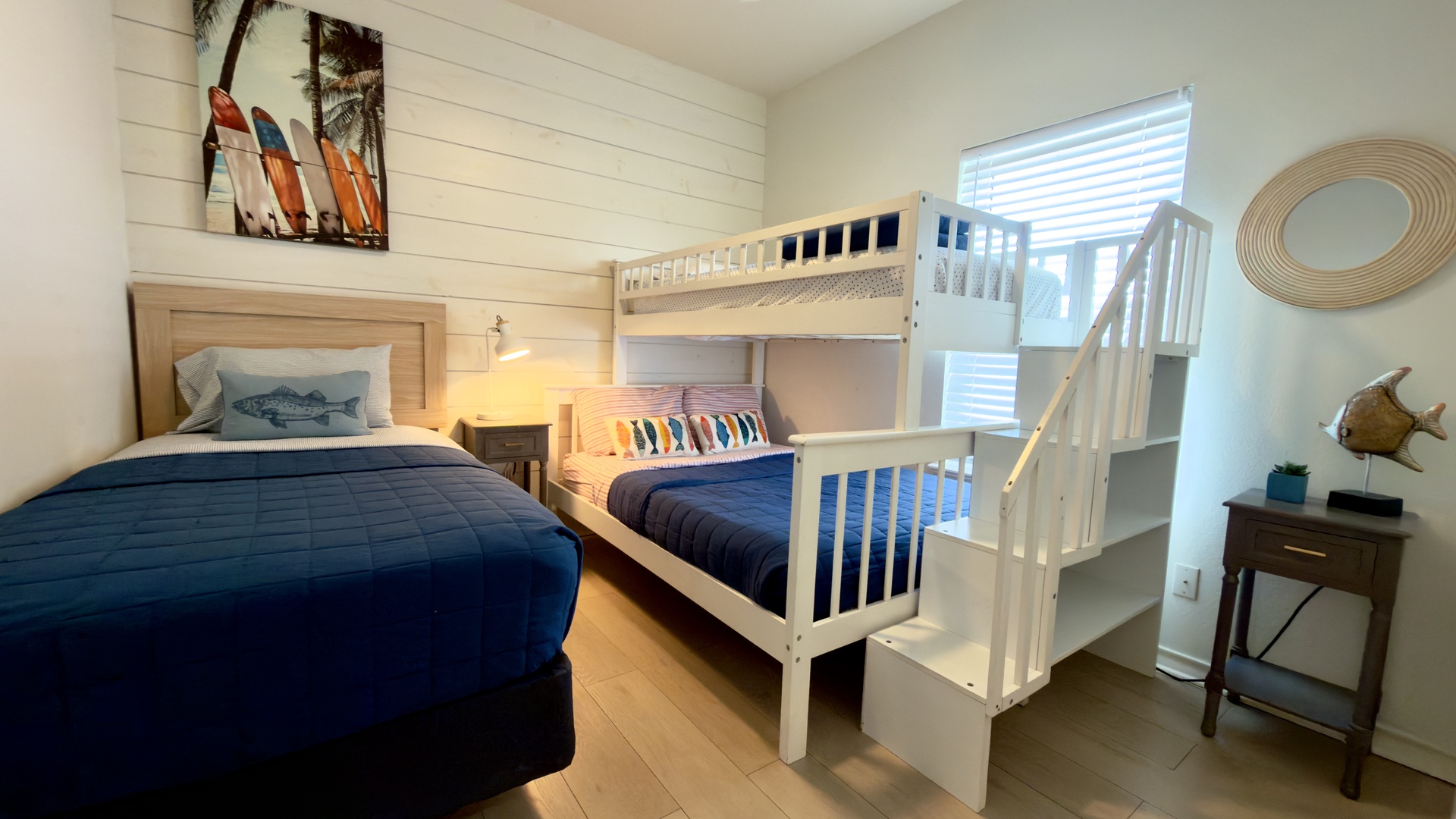 This home features a king bed in the bedroom. A queen and single twin in one guest room, and a bunk and extra twin in the third in the other room. This sleeps 9 guests. Per city permit, we cannot exceed 9.