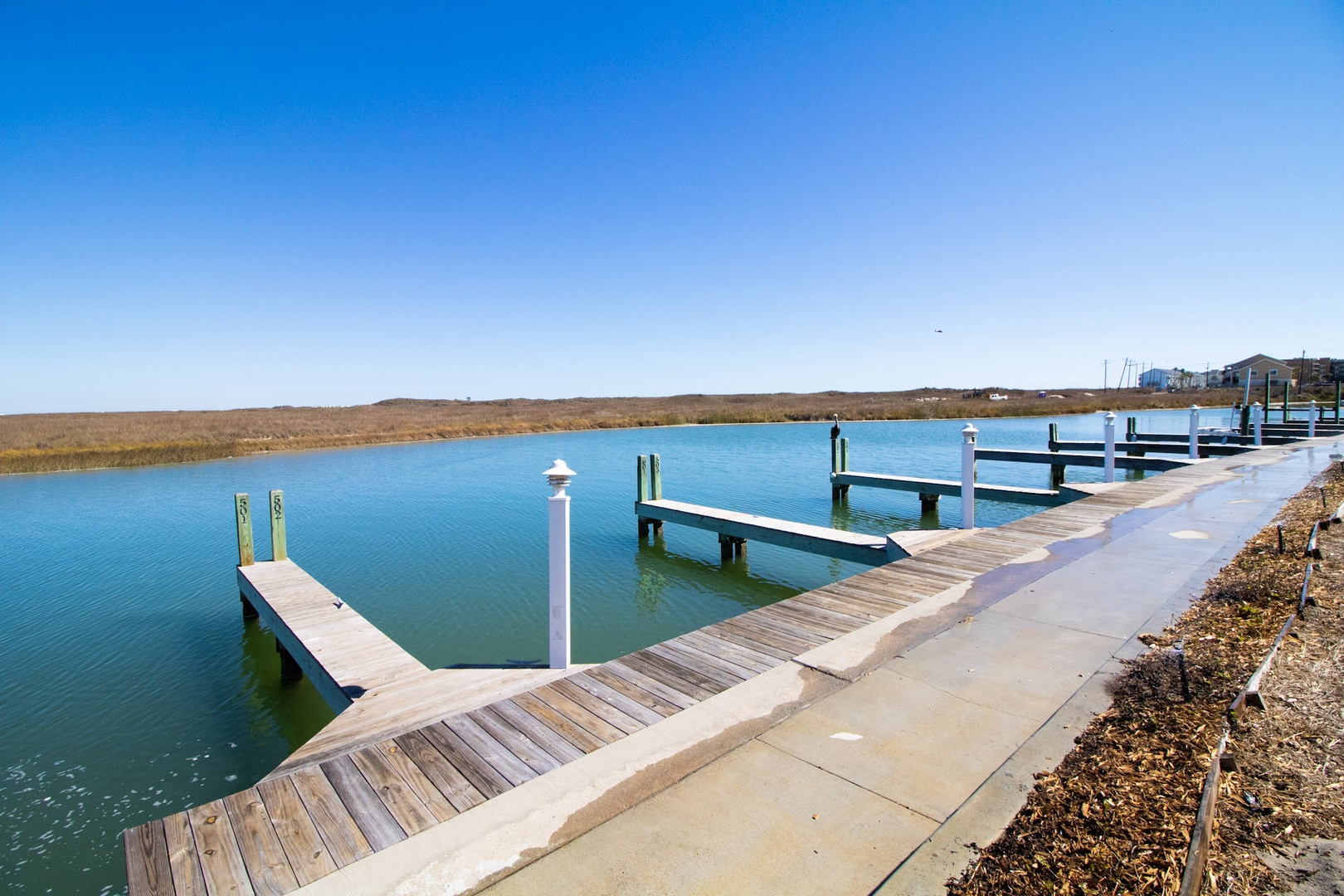 The boat slips are located to the side of the building with fishing docks guest may use to fish from also. These docks and slips are only for guests staying at this complex.
