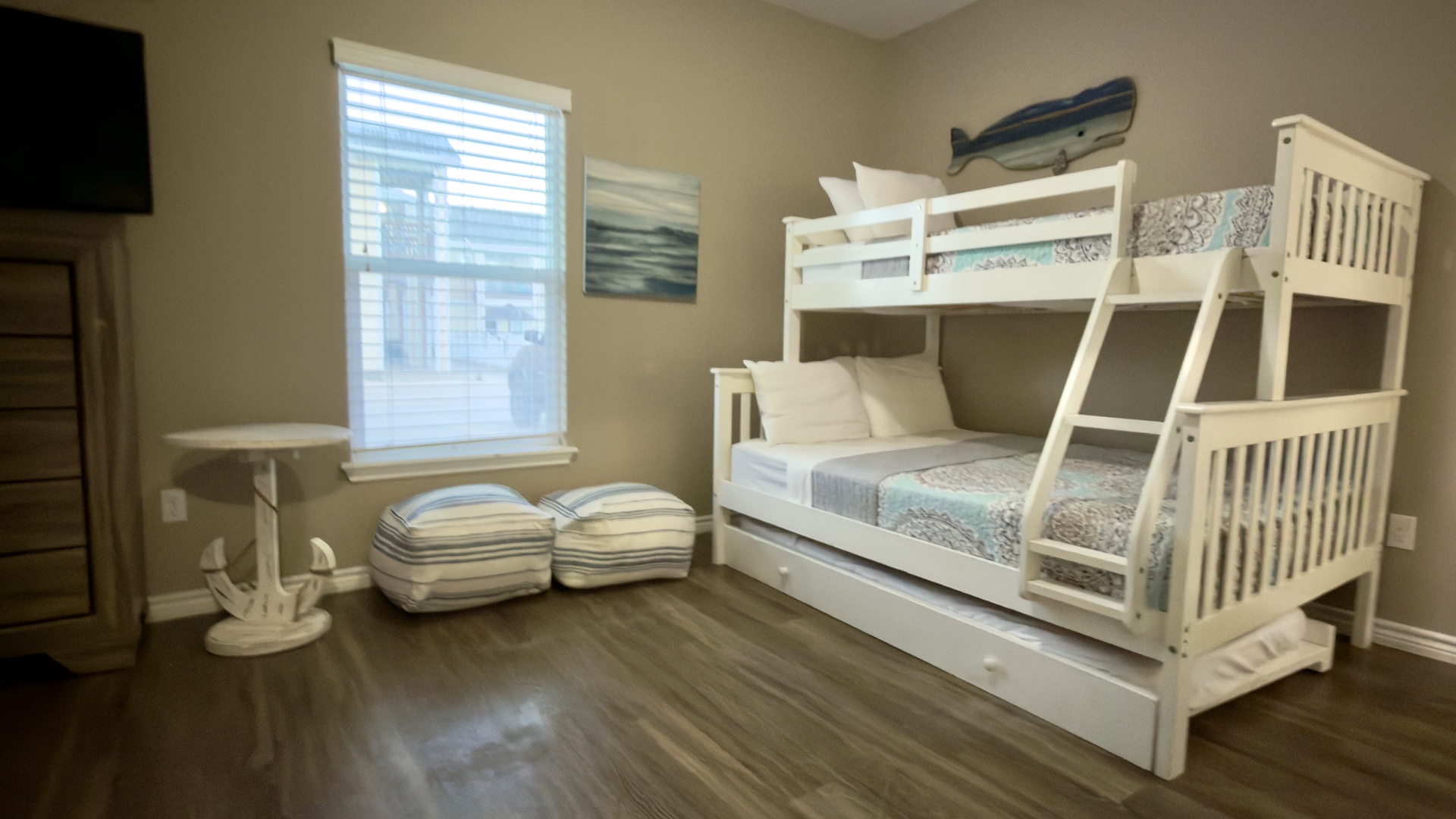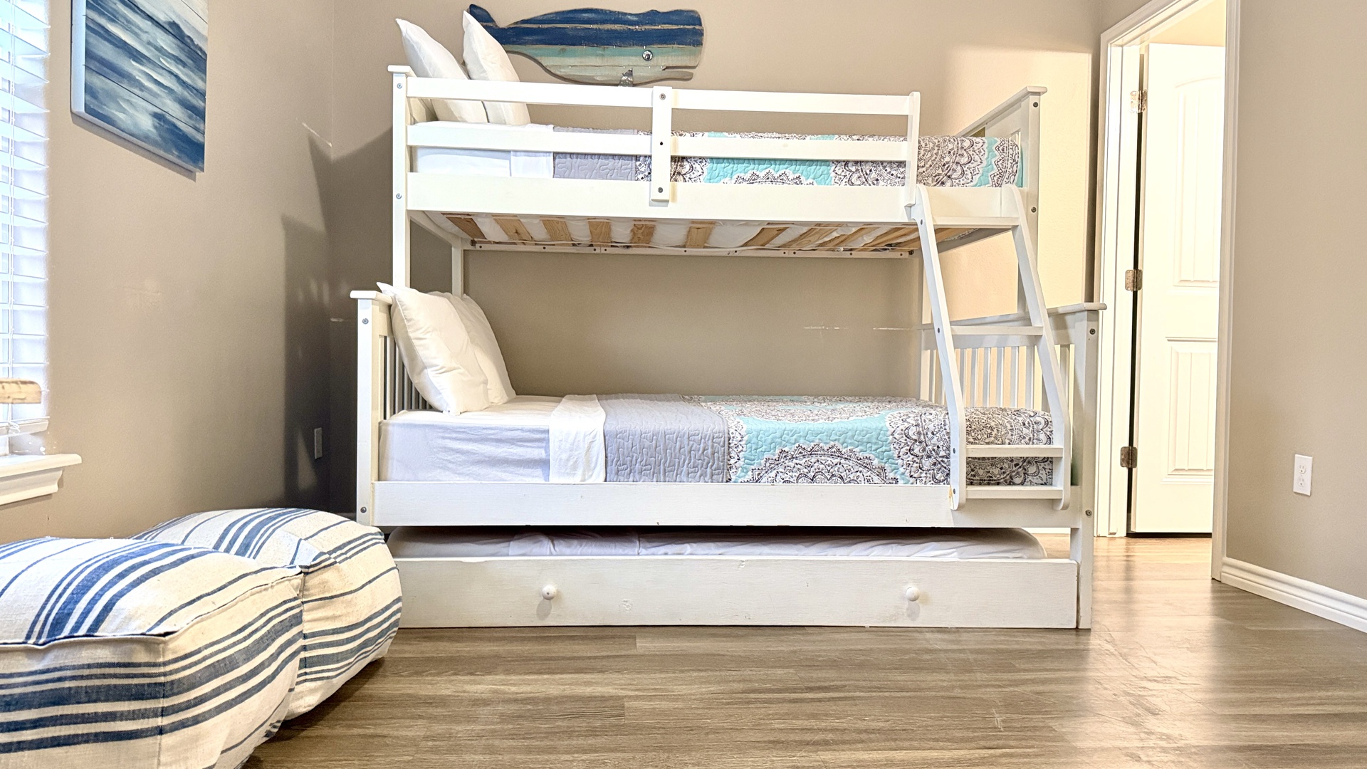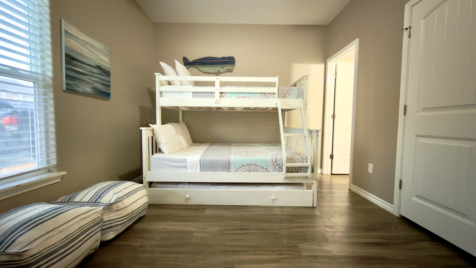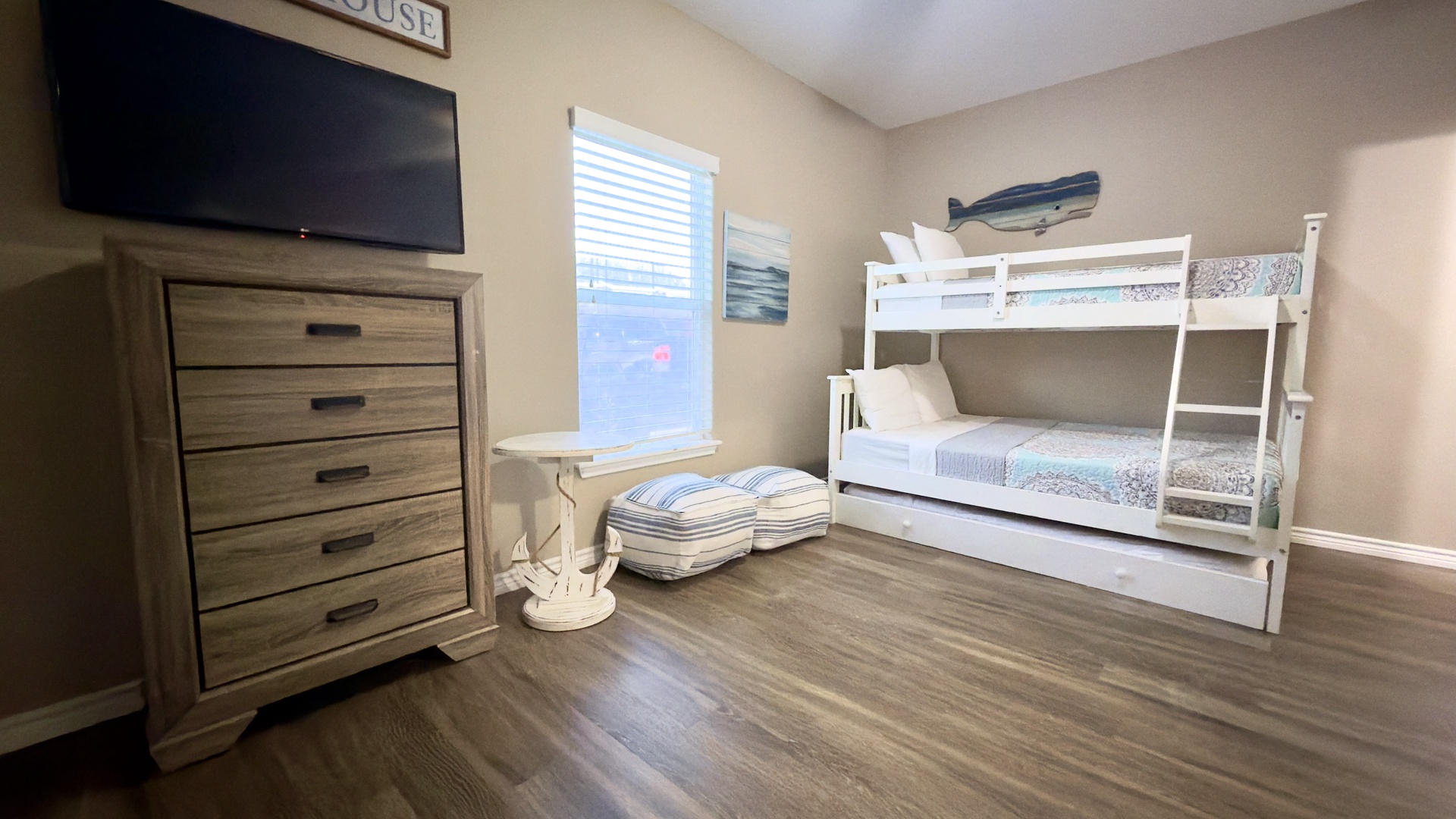 -2 Bedrooms: King bed in master bedroom, and a bunk bed with two twins and a full size bed in the guest room.